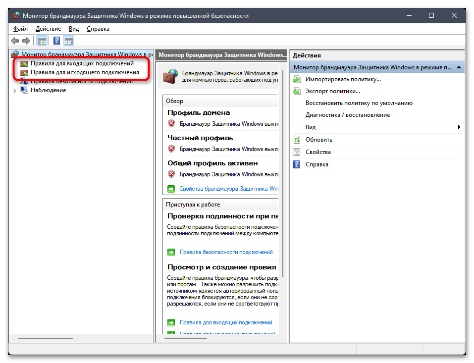 Слева вы видите две группы: для входящих и исходящих подключений. Напомним, что входящие подключения – это когда информация поступает на ваш компьютер, например скачивается файл через браузер, загружается содержимое веб-страниц или воспроизводится видео на YouTube, а исходящий – когда вы или программа на вашем ПК отправляет информацию в сеть.