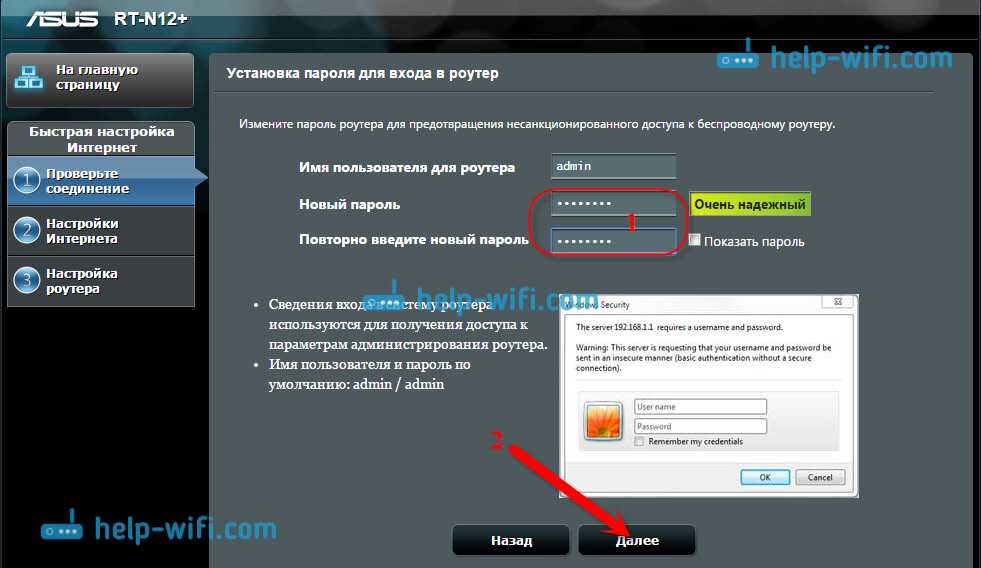 Дальше нам предложат установить пароль на защиту настроек роутера. Это нужно сделать обязательно. Укажите два раза пароль, запишите его где-то, что бы не забыть, и нажмите кнопку Далее.