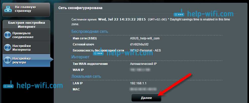 После подключения вернитесь снова к настройкам. Должно появится окно с информацией о подключении. Нажмите Далее.