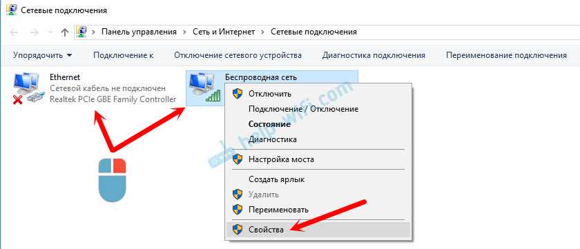 , и выбираем «Свойства». Для примера, я открыл свойства адаптера «Беспроводная сеть» (подключение по Wi-Fi)