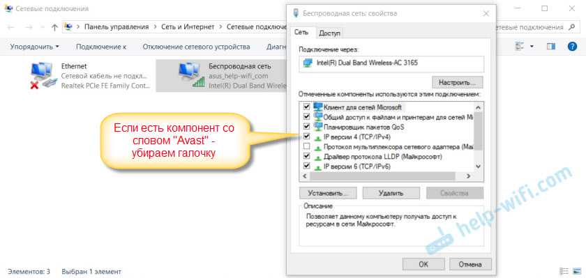 Проверяем, нет ли компонентов от антивируса Avast в свойствах подключения (Беспроводная сеть, или Ethernet)