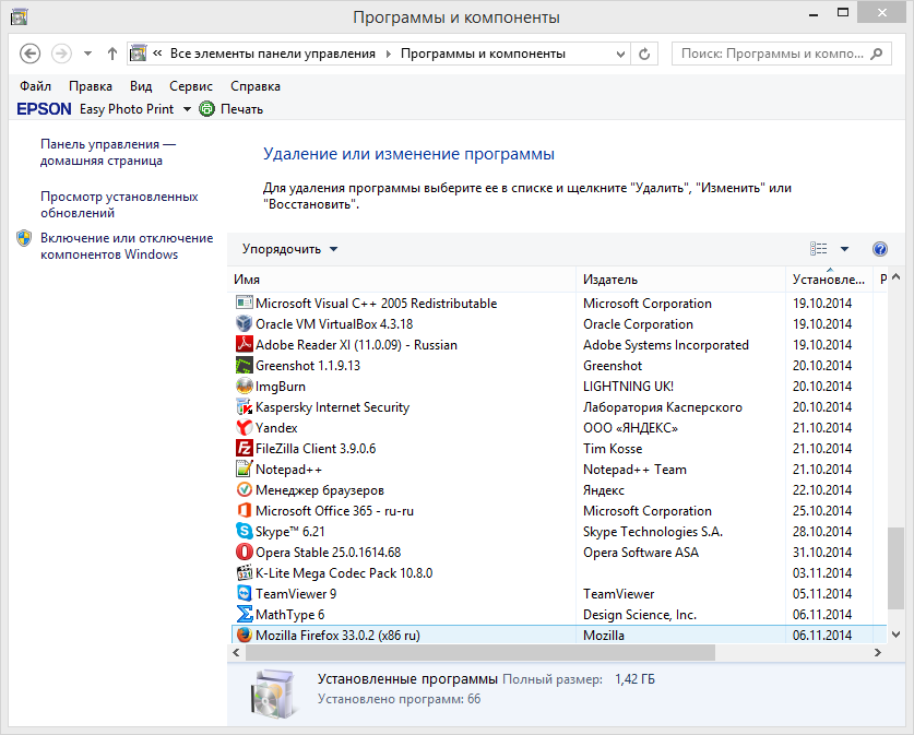 Нажав на значке «Программы и компоненты» мы увидим такое вот окошко: