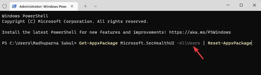 Скопируйте и вставьте приведенную ниже команду в Терминал и нажмите Enter:Get-AppxPackage Microsoft.SecHealthUI -AllUsers | Reset-AppxPackage