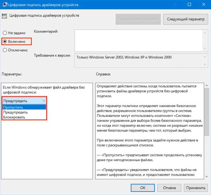 - Поставить галочку на «Отключено» или отметить «Включено», а в параметрах под надписью «Если Windows обнаруживает файл драйвера без цифровой подписи» выбрать пункт «Пропустить». Надавить .