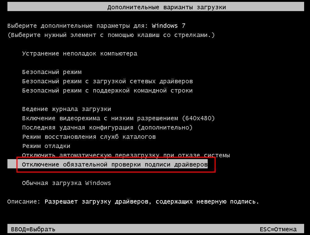 - Установить необходимые драйверы с отсутствующей цифровой подписью.