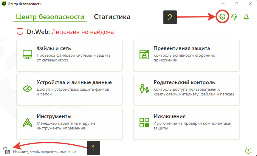 - Зайдите в Dr.Web и кликните на иконку замка.
