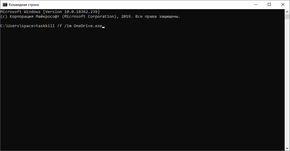 2. В командной строке набираем «taskkill /f /im OneDrive.exe». Таким образом, мы останавливаем службу OneDrive, которая стартует при запуске компьютера и постоянно висит в памяти.