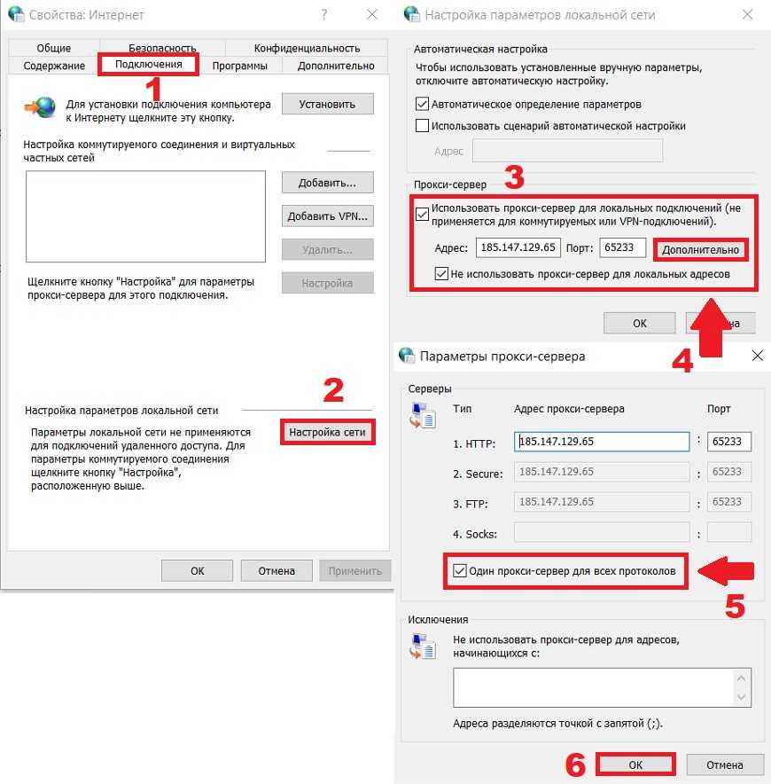 Ставим галочку как на картинке и прописываем адрес и порт выбранного вами сервера. Здесь же жмем дополнительные настройки и даем понять компьютеру, что хотим использовать один прокси для всех протоколов: