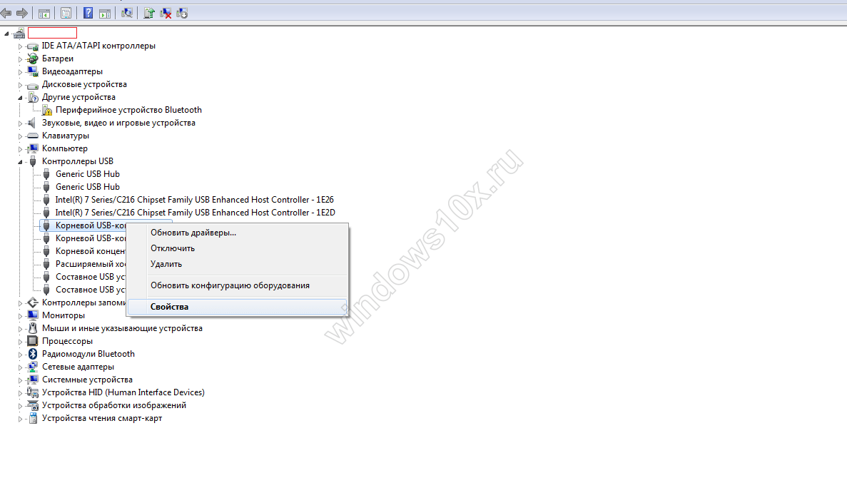 «Контроллеры USB» → «Корневой USB-концентратор» → ПКМ «Свойства»