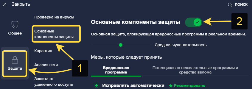 - Перейдите к «Компоненты защиты» и отключите требуемые объекты.