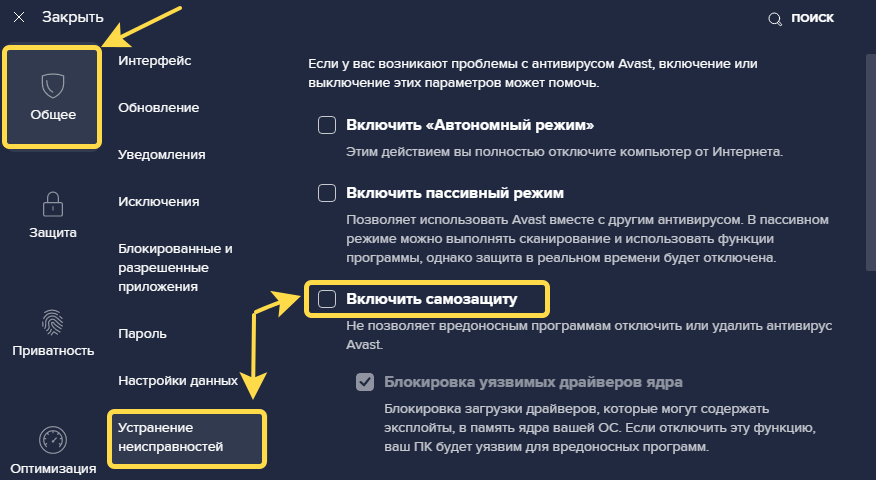 - В разделе «Общее» перейдите на вкладку «Устранение неисправностей» и снимите галочку в опции «Включить самозащиту».