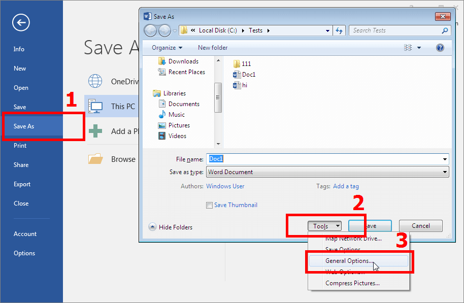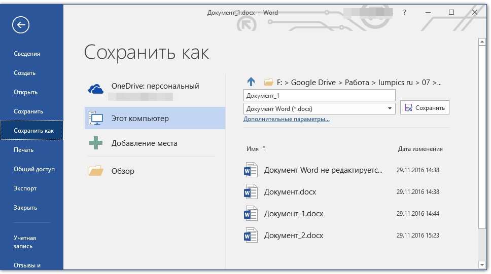Окно настроек сохранения файла в Microsoft Word 2016-2021