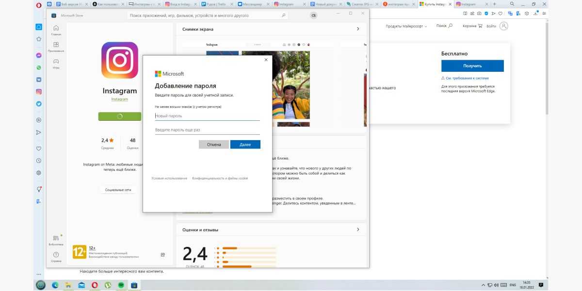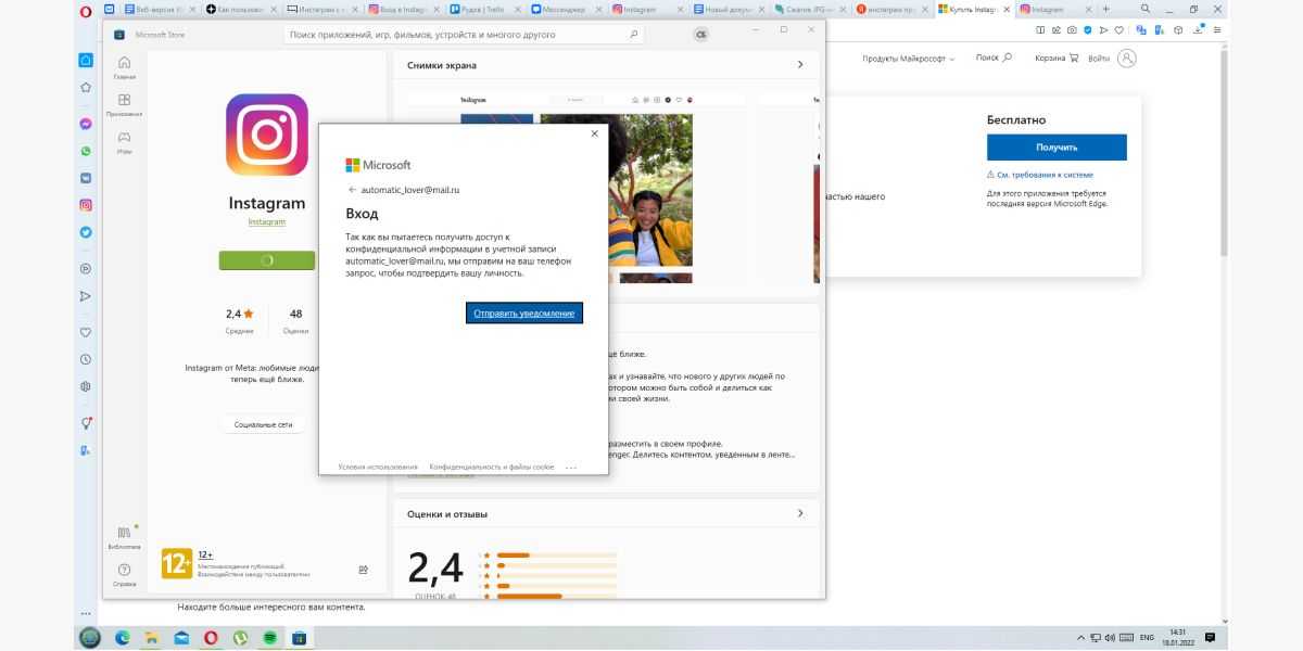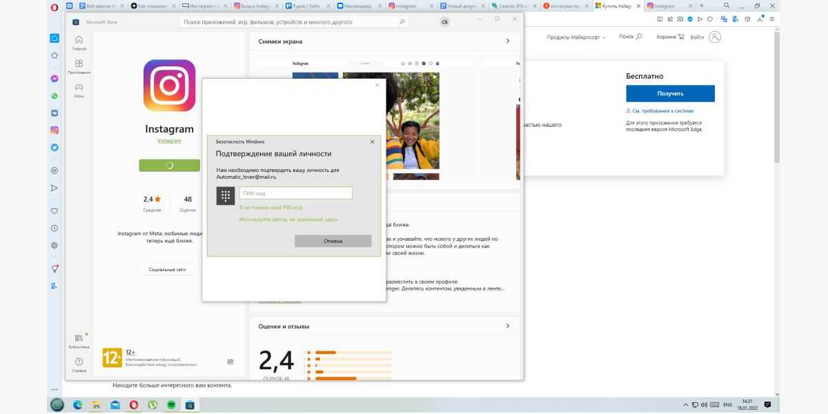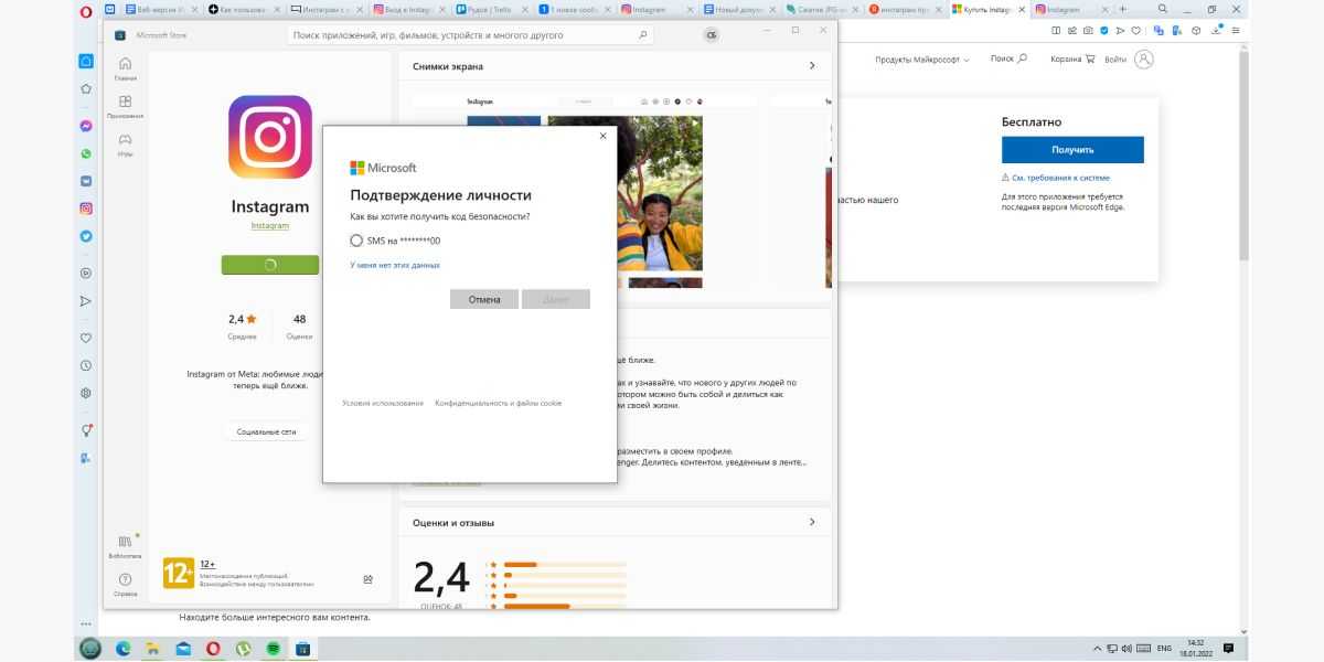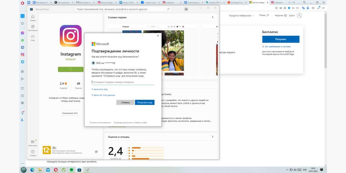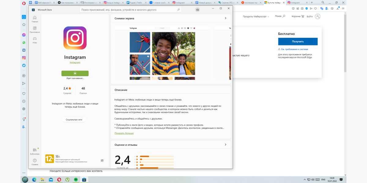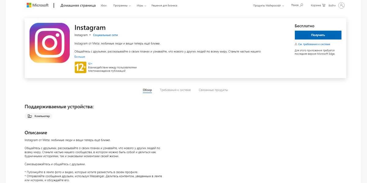 Чтобы загрузить бесплатное приложение Инстаграма* для Windows 10, нужно в любом поисковике вбить запрос «Приложение Инстаграм* для Windows 10» и перейти на сайт Microsoft. Затем останется только нажать «Получить».