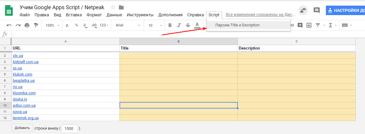 Создание таблицы Google Drive / Scripts и наполнение её контентом