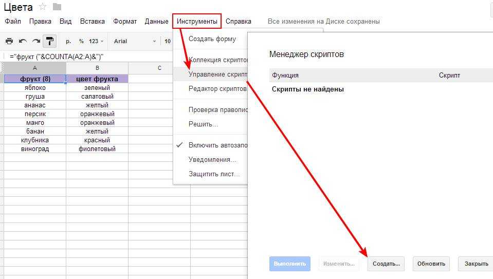 Теперь проверим функцию. Выделяем диапазон B2:B9, заходим в меню «Скрипты» и выбираем опцию «Покрасить». Смотрим, как наши фрукты обрели жизнь цвета ![]()