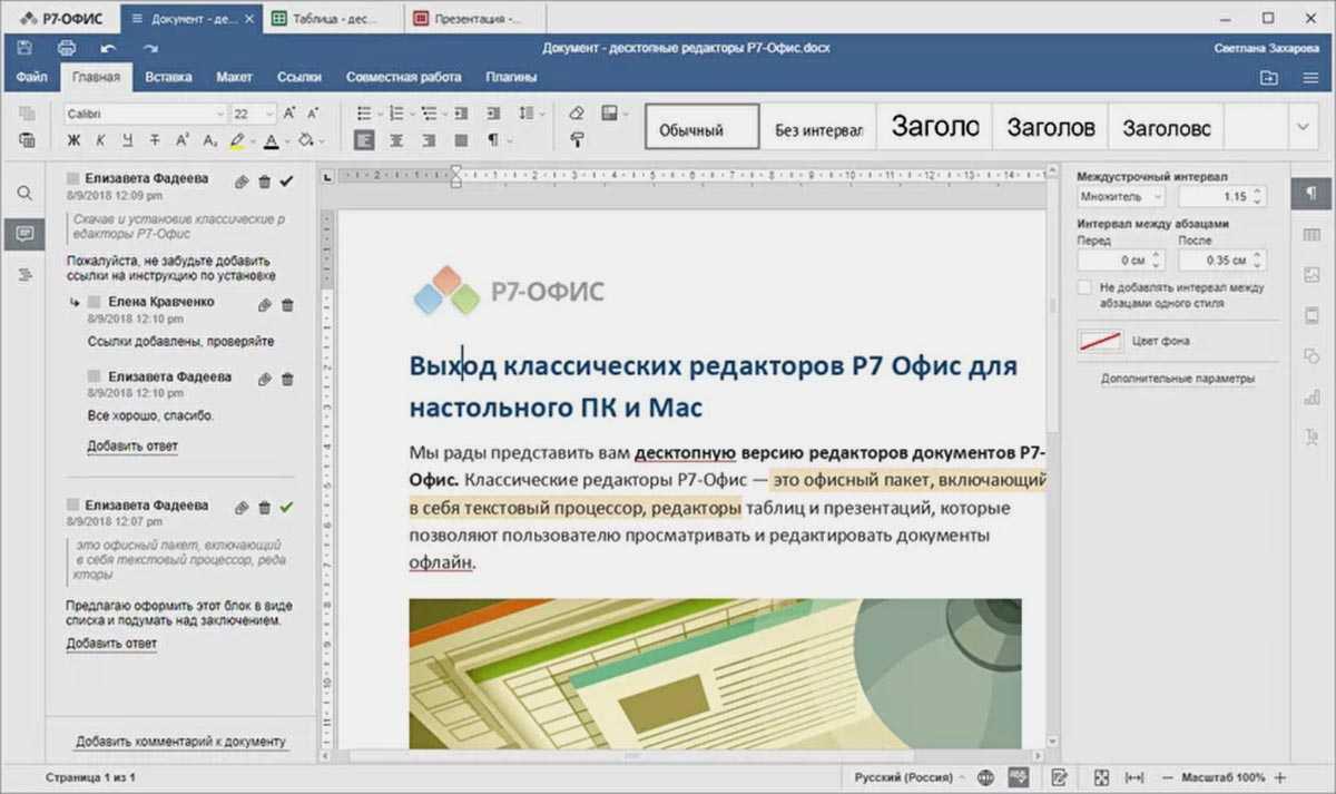 Довольно интересный продукт с не самым логичным и запоминающимся названием. Разработчики сделали ставку на максимальную совместимость с оригинальными форматами документов от Microsoft. Нас уверяют, что при поочередном редактировании файлов в MS Office и Р7-Офис вы не увидите ни единого отличия в документе и не получите коллизий при пересохранении файлов.