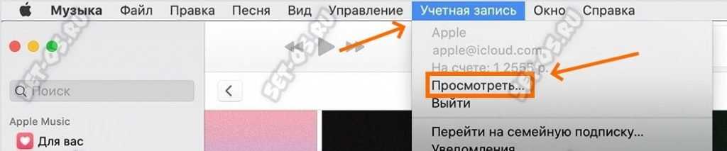 - В строке меню на компьютере Mac выберите «Учетная запись» > «Настройки учетной записи». Либо в строке меню iTunes на компьютере с Windows выберите «Учетная запись» > «Просмотреть». Может потребоваться вход с помощью идентификатора Apple ID.
