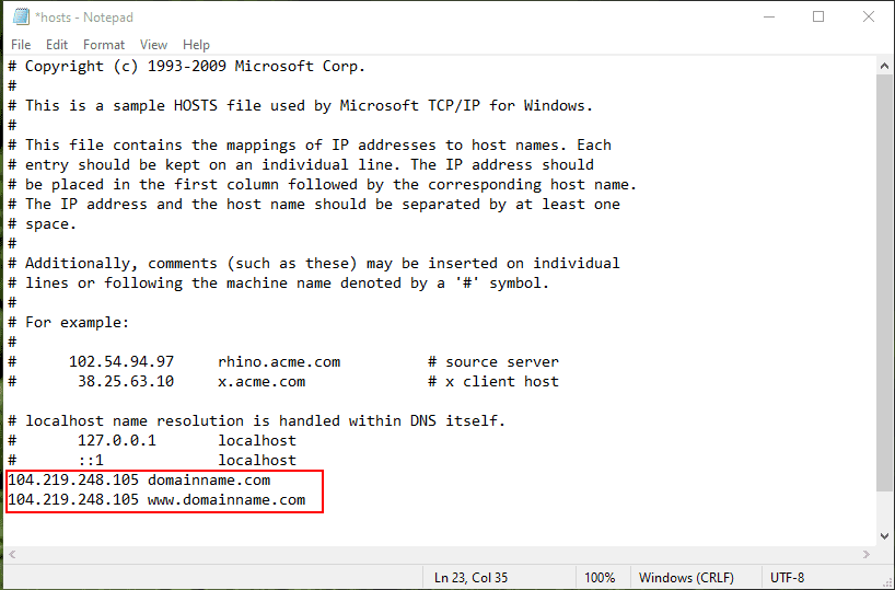 - Скопируйте и вставьте содержимое текущего файла hosts в этот файл в Блокноте.