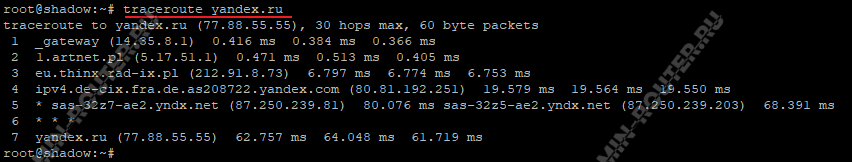 В моём случае от домашнего компьютера до сайта yandex.ru совершено 7 хопов, пройдя через 5 промежуточных узлов. На каждом из прыжков указывается время, за которое тестовый пакет дошёл до этого узла и вернулся обратно.
