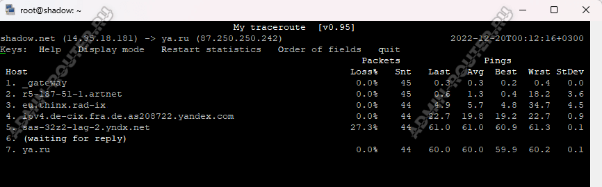 Запускается утилита MTR всё так же из терминала командой mtr. Пример: