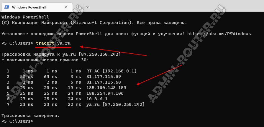В остальном, использование данной утилиты ничем особо не отличается от того, как мы это делали в Windows 11. Для примера сделаем трассировку до Яндекса. Команда: