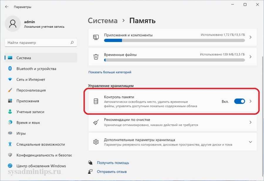 Контроль памяти (Storage sense) – это функция, которая появилась еще в Windows 10. С помощью этой функции система будет следить за объемом свободной дисковой памяти вашего компьютера или ноутбука. Она автоматически будет освобождать место, удалив ненужные файлы из системы. К нежелательным файлам могут относиться временные системные файлы, элементы в корзине и другие.