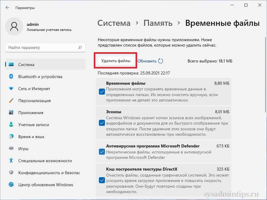 Нажмите на “Временные файлы”. Выберите файлы, которые необходимо удалить, например, эскизы, кэш DirectX, файлы Microsoft Defender и другие.