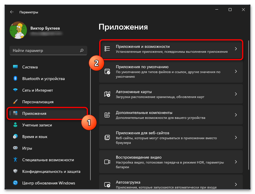 - В том же приложении «Параметры» выберите раздел «Приложения» и перейдите в категорию «Приложения и возможности».