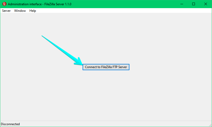 Click on the connect button to establish a connection between the Filezilla server interface and the Filezilla service. The default password is blank. Please note that this connection is purely meant for administering the server. It has nothing to do with an actual FTP connection.