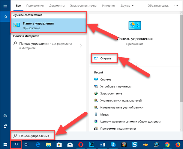 Способ 2. Нажмите в левом нижнем углу рабочего стола, рядом с кнопкой «Пуск», кнопку «Поиск», представленную в виде лупы. Затем в открывшейся панели в строке поискового запроса введите фразу «Панель управления». В строке «Лучшее соответствие» будет представлен искомый вариант. Щелкните его левой кнопкой мыши или в дополнительной боковой панели нажмите на кнопку «Открыть», и приложение будет запущено мгновенно.