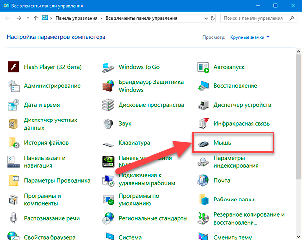 Теперь в окне «Все элементы панели управления», отвечающем за настройку параметров компьютера, отыщите и нажмите на раздел «Мышь», управляющий различными характеристиками манипулятора, в том числе и назначением кнопок.