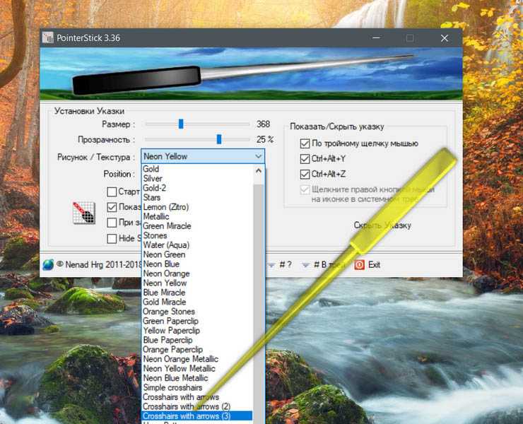 В эффектную указку курсор мыши превращается при тройном щелчке мыши или по горячим клавишам, указанным в окне утилиты. По этим же щелчкам или клавишам указка превращается обратно в курсор мыши. Для указки предусмотрен выбор цветов и текстур, можно настроить прозрачность и размер. PointerStick работает из системного трея, откуда, собственно, её и можно вызвать для настройки вида указки.