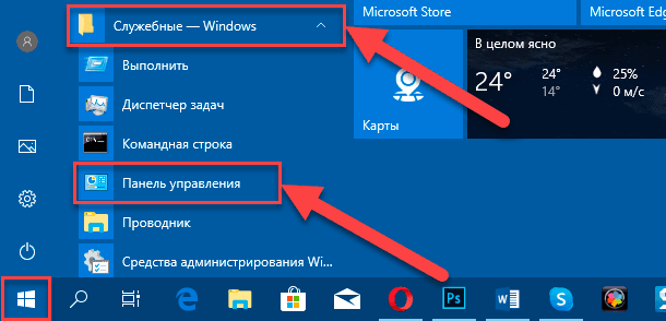 Способ 1. Нажмите на «Панели задач» в левом нижнем углу кнопку «Пуск», затем в открывшемся главном пользовательском меню «Windows», при помощи бегунка полосы прокрутки, отыщите и щелкните раздел «Стандартные-Windows», в котором из вложенного списка дополнительных разделов выберите вариант «Панель управления».