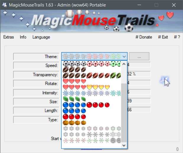 Но звёздный след – только главный эффект утилиты, его можно сменить на снежинки, мячи, сердечки, шарики, камни. И тогда за курсором будет следовать уже скопление именно этих объектов.
