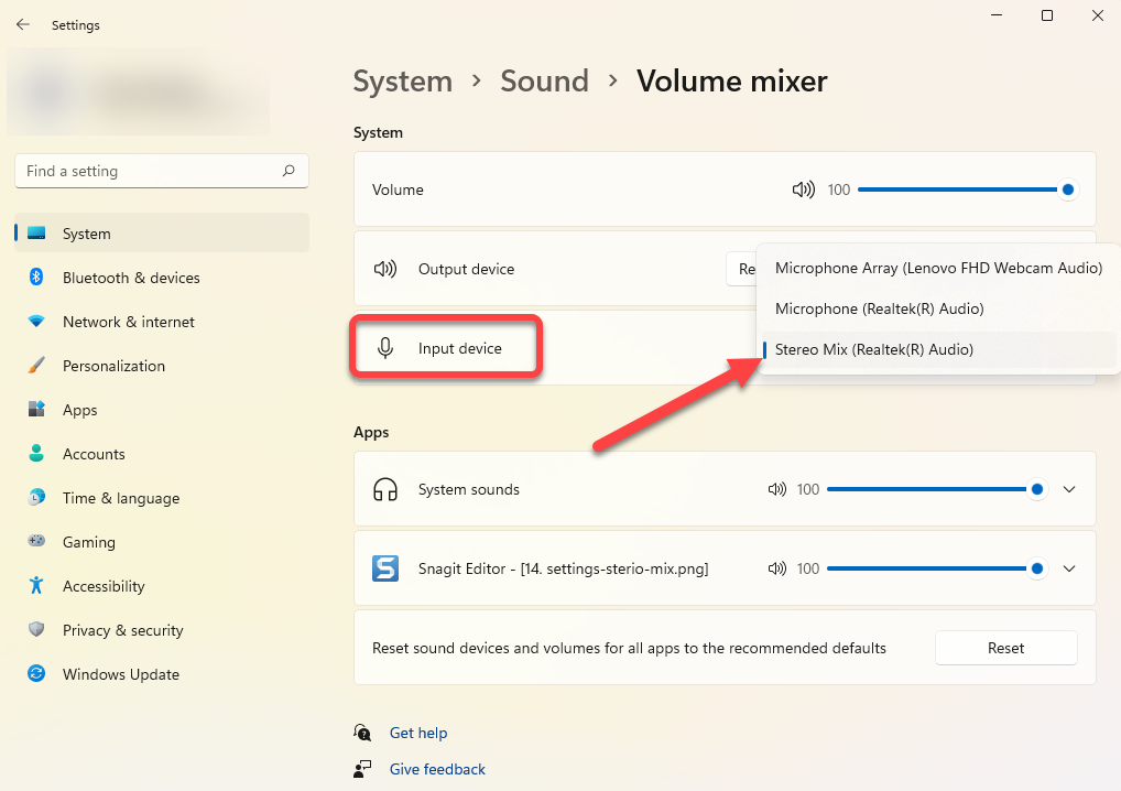 - Затем вернитесь на главный экран «Настройки» и перейдите(Settings home screen and navigate) в « Система»(System ) > « Звук(Sound ) » > « Микшер громкости( Volume mixer) » . В раскрывающемся списке выберите устройство ввода(Input device ) как Stereo Mix.