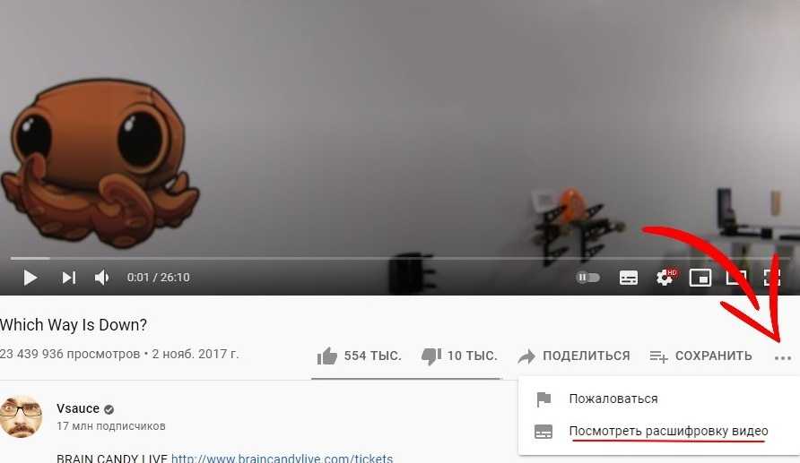 Для этого после открытия видео YouTube нажмите на кнопку меню в виде трех точек, которая находится под заголовком видео справа, и выберите «Посмотреть расшифровку видео».