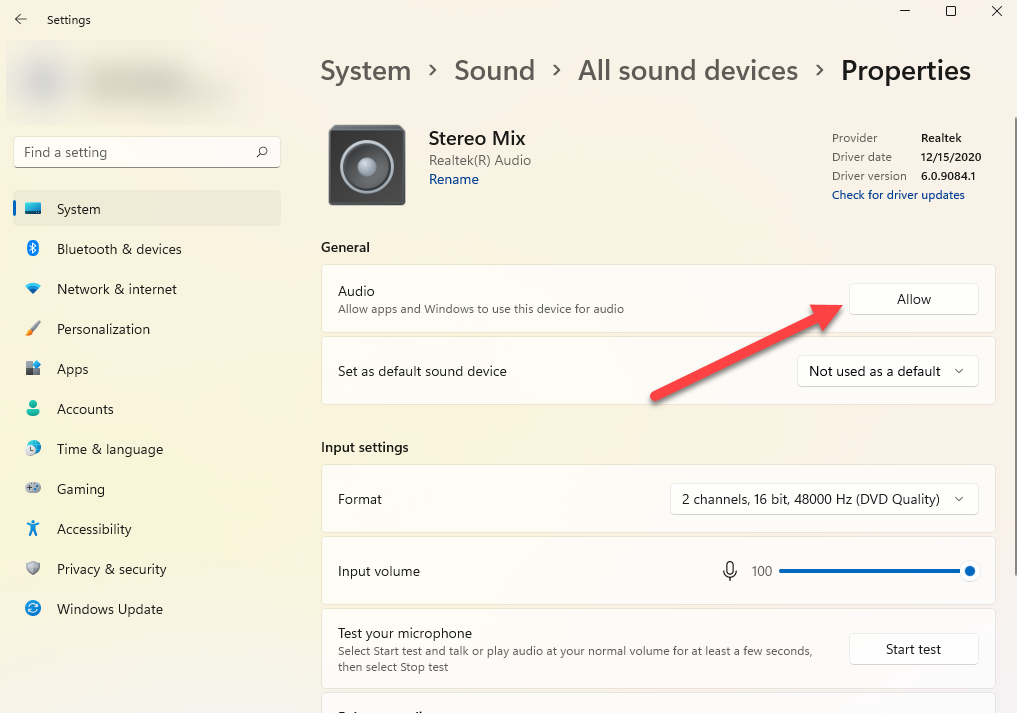 - В Windows 11 нажмите Ctrl + I , чтобы запустить приложение «Настройки(Settings app) », перейдите в « Система»(System ) > « Звук(Sound ) » > « Все звуковые устройства( All sound devices ) » > « Stereo Mix » и выберите « Разрешить(Allow) » .