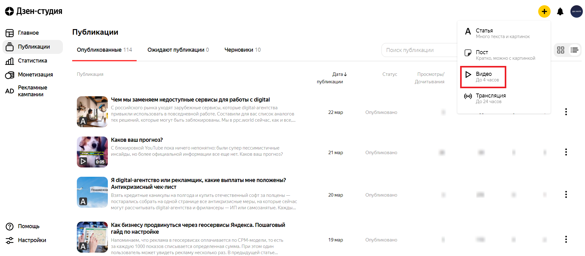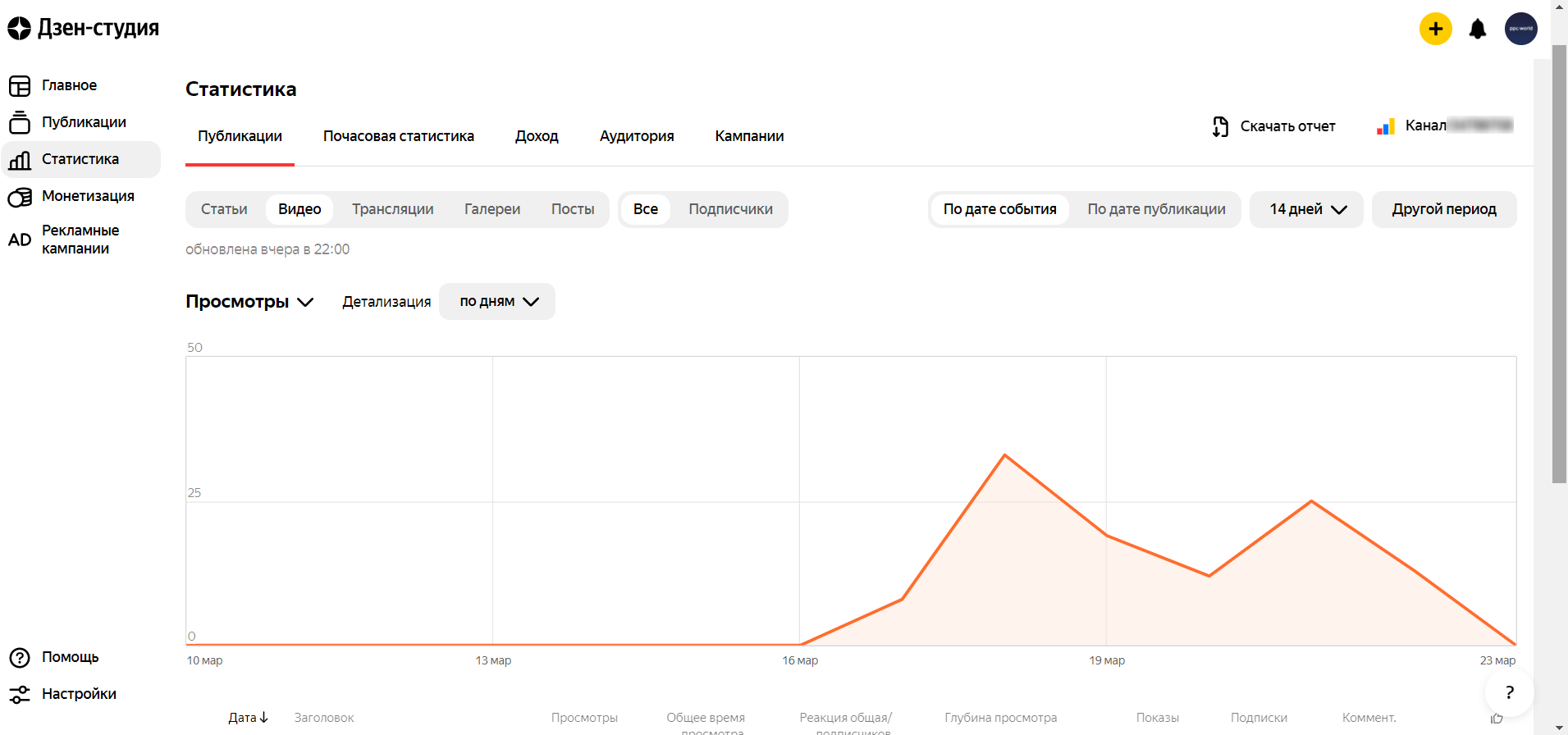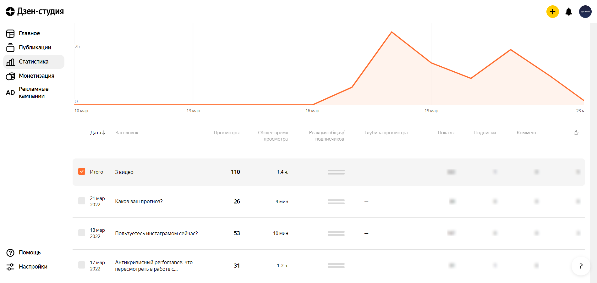 С аналитикой на площадке тоже всё хорошо: в Дзен-студии есть отдельная страница статистики с подробными данными по каждой публикации, которые можно отфильтровать по времени, формату поста, метрикам. Также в статистике есть отдельные вкладки в верхнем горизонтальном меню, в которых можно посмотреть данные по доходу, аудитории и рекламе.