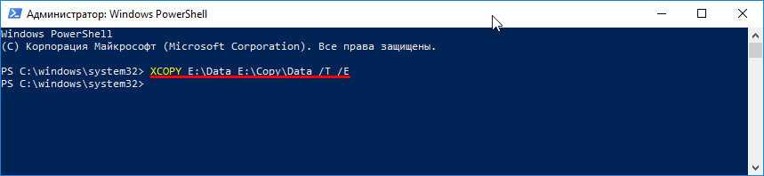 Создав пустую папку Data в другом месте, открываем PowerShell или командную строку и выполняем команду XCOPY «путь-к-папке-с-файлами «путь-к-пустой-папке» /T /E .