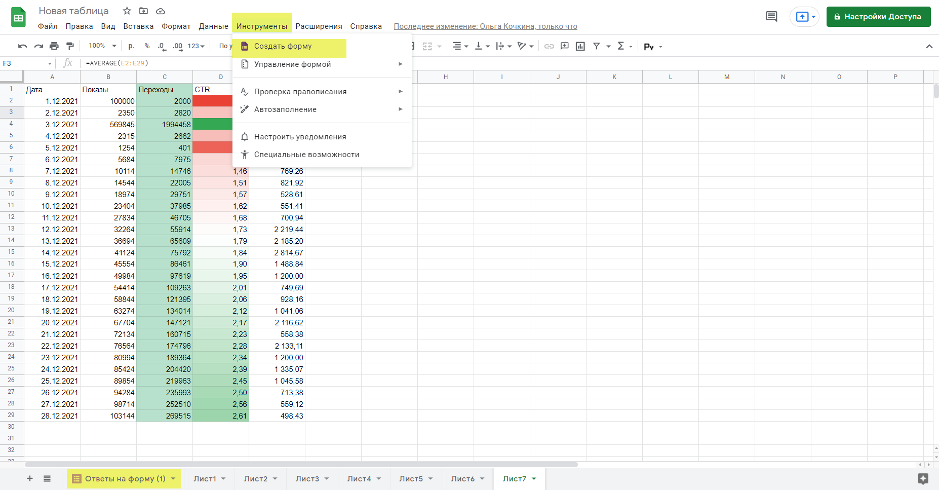 По клику создаются лист «Ответы на форму» и новая пустая анкета в сервисе Google Forms