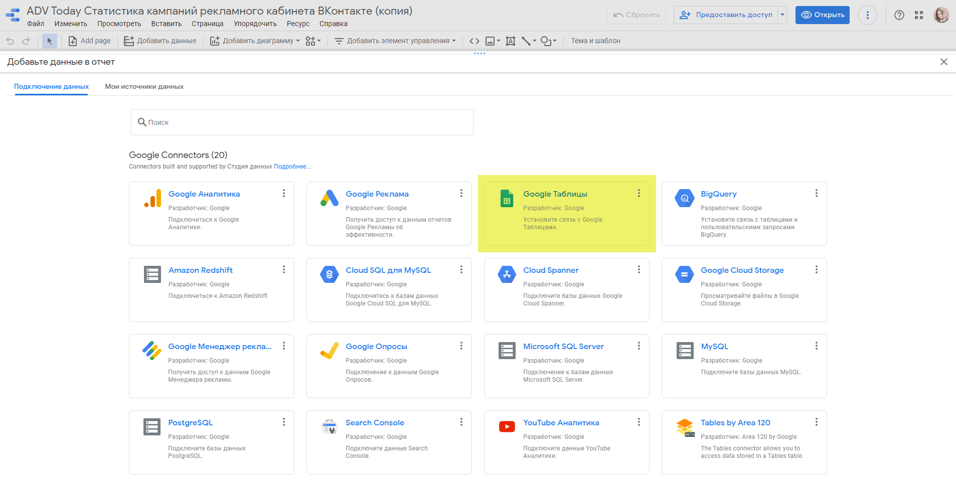 Google Data Studio – подключается через коннектор и позволяет подтягивать данные из таблицы в отчет «Студии Данных».