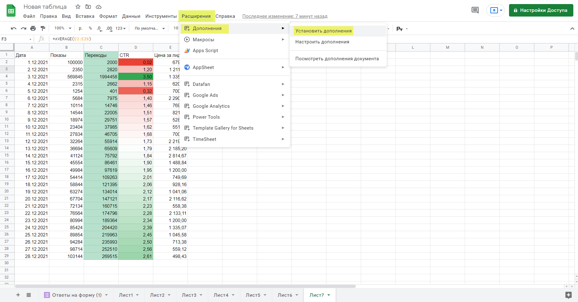 Google Analytics – подключается через дополнение Google Sheets, импортирует в таблицу и автоматически обновляет данные из гугловской системы веб-аналитики.