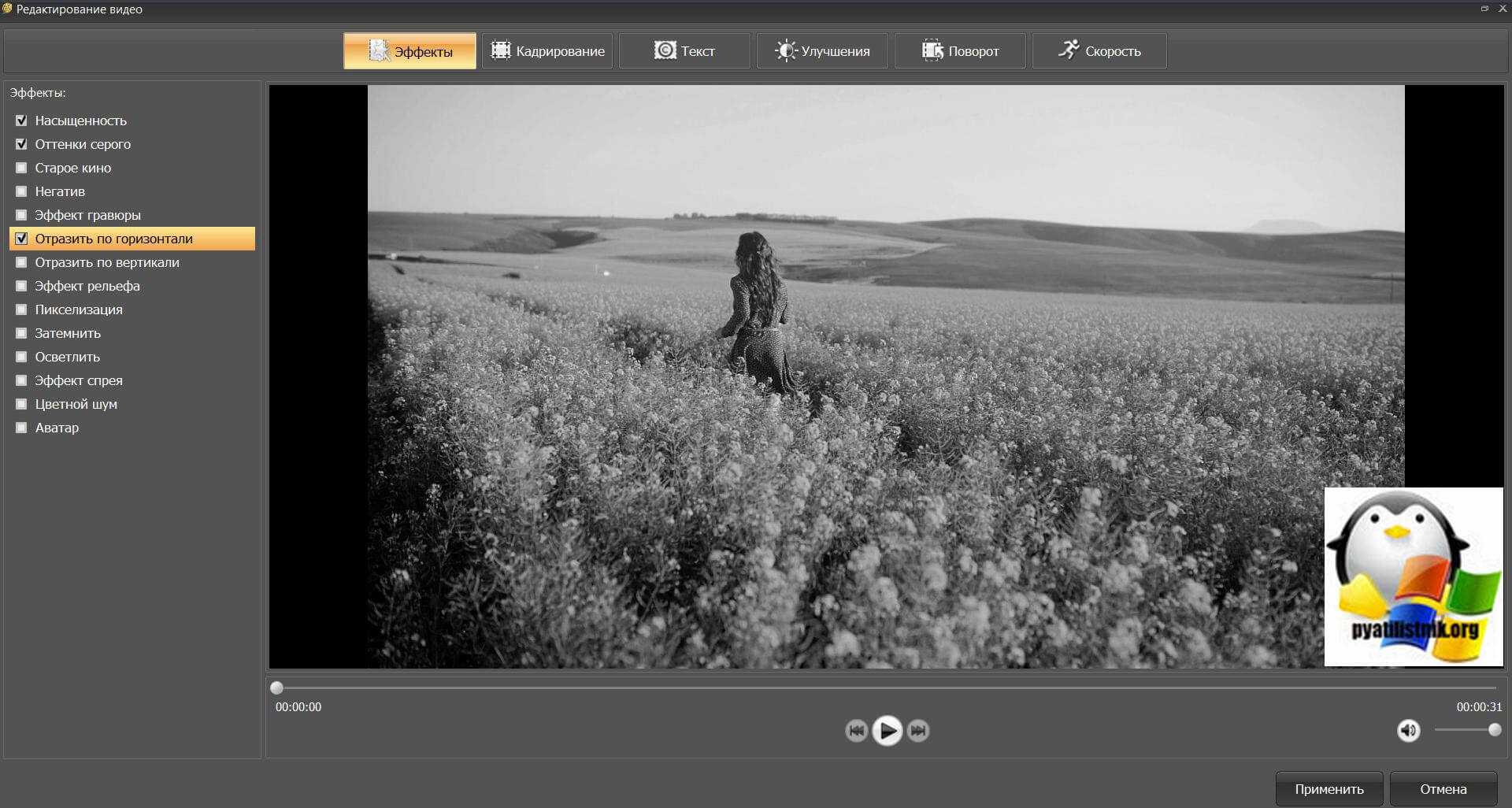 В разделе «Эффекты» вы сможете улучшить видеоряд: применить фильтры, обрезать кадр, стабилизировать клип, добавить текст и произвести свето- и цветокоррекцию. Эффекты можно сочетать друг с другом