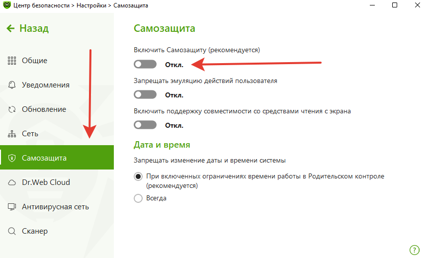Прежде чем запускать, отключите самозащиту антивирусника. Для этого откройте главное окно центра безопасности, перейдите в настройки на вкладку «Самозащита» и отключите соответствующую опцию. Подробнее в отдельной инструкции: «отключение самозащиты Dr Web«.