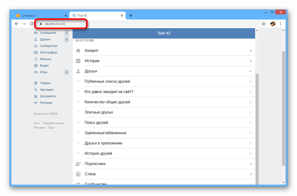 - Оказавшись на главное странице Tool 42, в блоке «Категории» разверните список «Друзья». Для продолжения необходимо выбрать функцию «Очистка друзей».