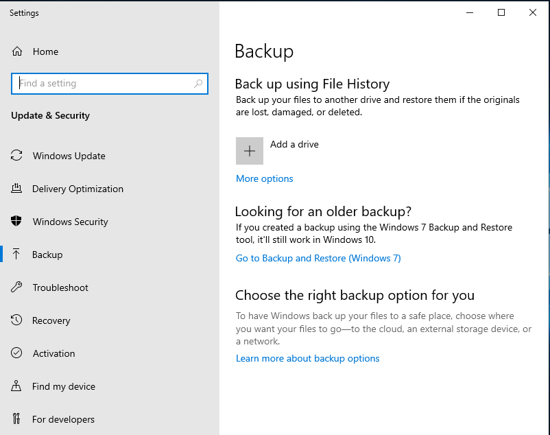 Примечание. Если вы видите сообщение «Резервное копирование Windows не настроено», пропустите другие шаги в этом разделе. Это означает, что на вашем диске нет старого файла резервной копии Windows 7.