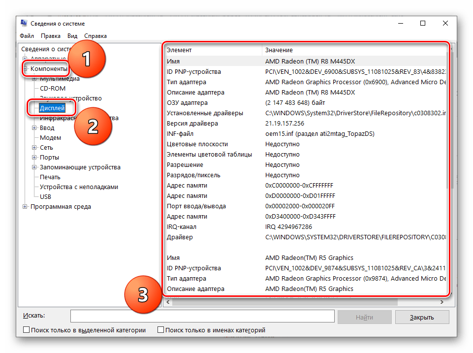 В «Сведениях о системе» нужно перейти в «Компоненты», затем открыть «Дисплей». В строке «Имя» пользователь увидит информацию об установленной графической карте и о количестве используемой памяти.