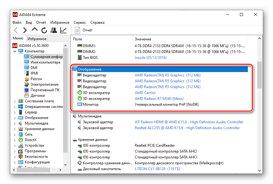 AIDA64 – обширное приложение для диагностики компьютера, предоставляющее пользователю огромное количество информации касаемо подключенных устройств и т.д. С его помощью можно узнать не только работающую в данный момент видеокарту, но и другие подробности графического модуля. Придерживайтесь следующего алгоритма: