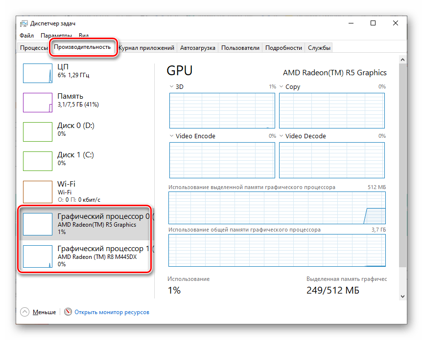 Здесь можно не только узнать работающие в данный момент видеокарты, но и отследить уровень загруженности каждой из них. Это наглядно показывает принцип, подразумевающий одновременное использование системой двух адаптеров для различных задач.
