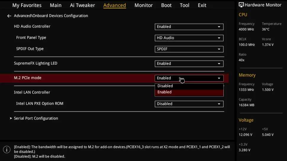 Зайдите в раздел Advanced -> Onboard Devices Configuration, выберите настройку М.2 Configuration, откройте ее выпадающее меню и посмотрите, имеется ли там PCIE Mode или пункт с похожим названием.